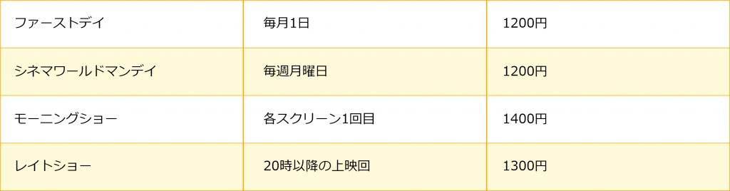 | 109シネマズデイ | 毎週水曜日 | なし | 1,300円 |